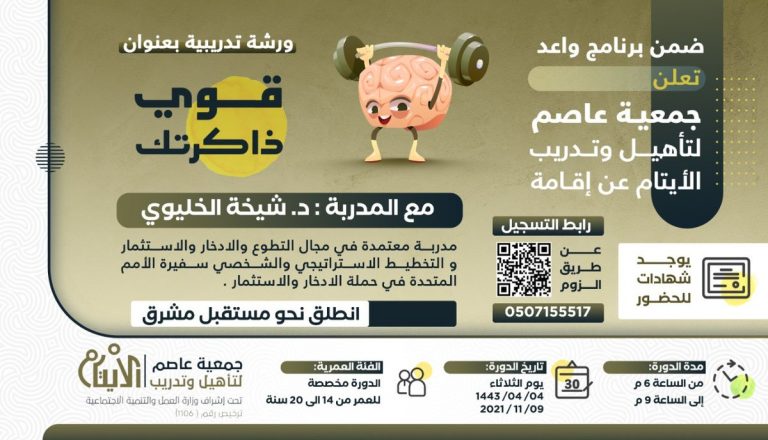 ضمن برنامج واعد قدمت جمعية عاصم لتأهيل وتدريب الأيتام الورشة التدريبية قوي ذاكرتك مع المدربة : د.شيخة الخليوي يوم الثلاثاء الموافق 4/ 4 / 1443هـ الموافق 9 /11 / 2021م بحضور أكثر من 45 يتيم و يتيمة