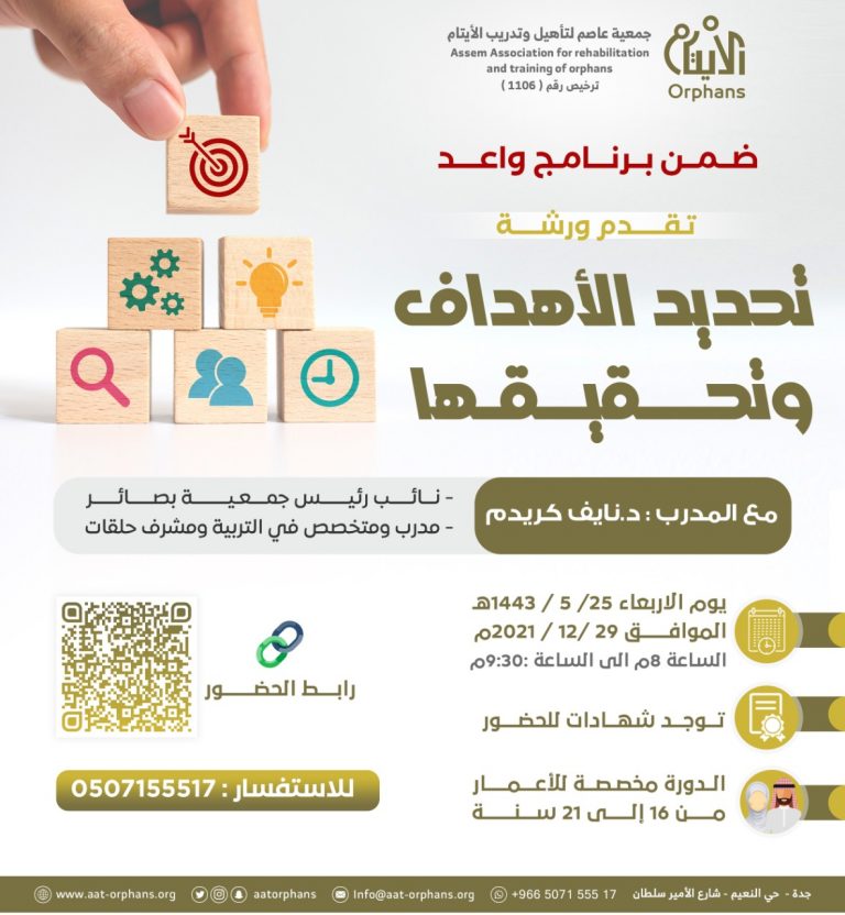 ضمن برنامج واعد قدمت الجمعية الورشة التدريبية : تحديد الاهداف وتحقيقها مع المدرب الدكتور:نايف كريدم يوم الاربعاء الموافق 25/ 5 / 1443هـ الموافق 29 /12 / 2021م بحضور اكثر من 50 يتيم ويتيمة